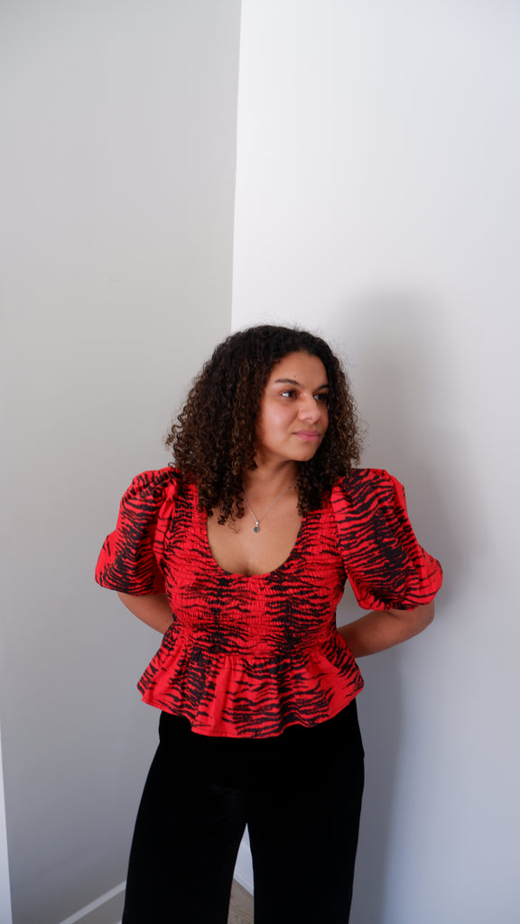 GANNI Crimson Shirred Puff Sleeve Blouse - M/L