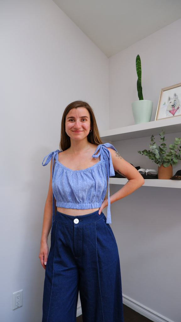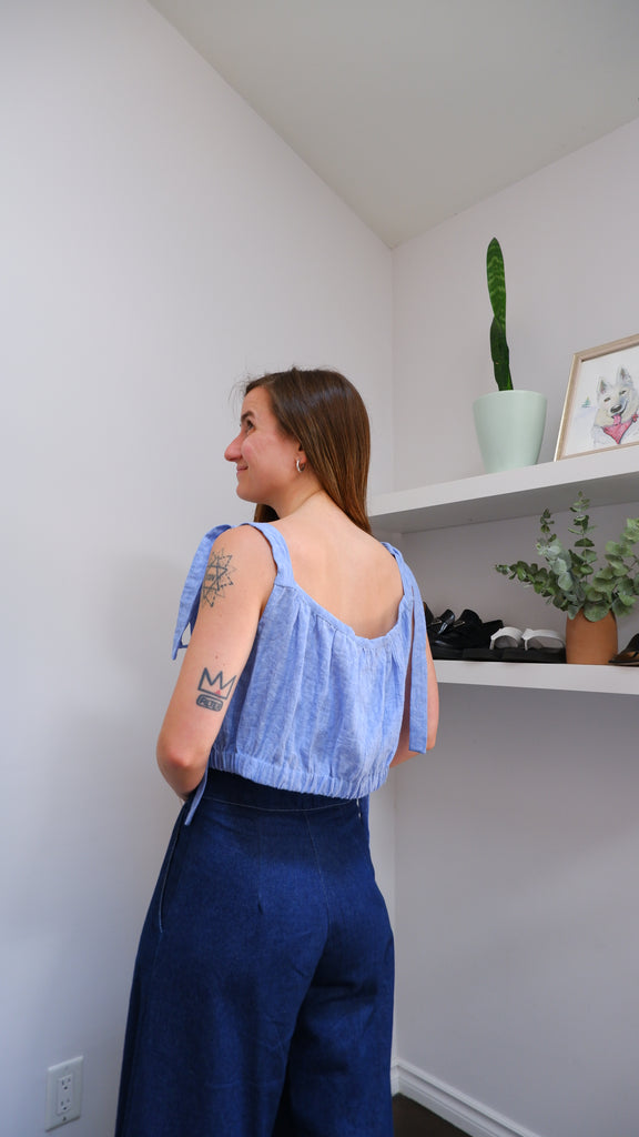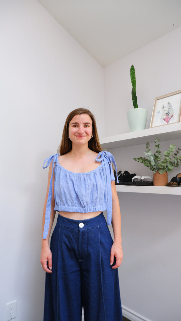 The Ocean Breeze Top in Italian pre-washed silk cotton deadstock fabric features adjustable shoulder straps. From everyday looks to a night out with the Ocean Breeze top paired with wide leg jeans and platform sandals, you are set for summer.