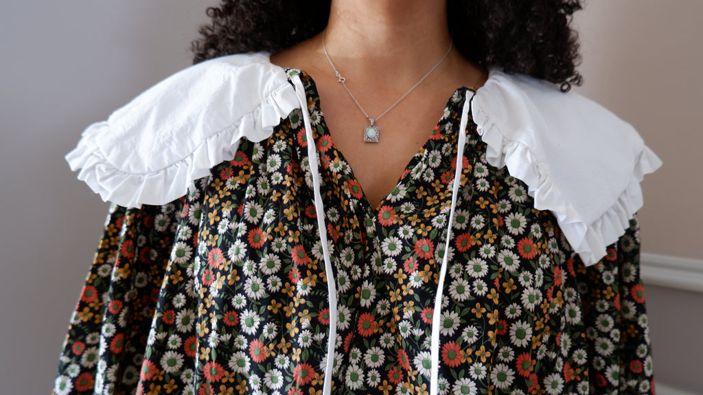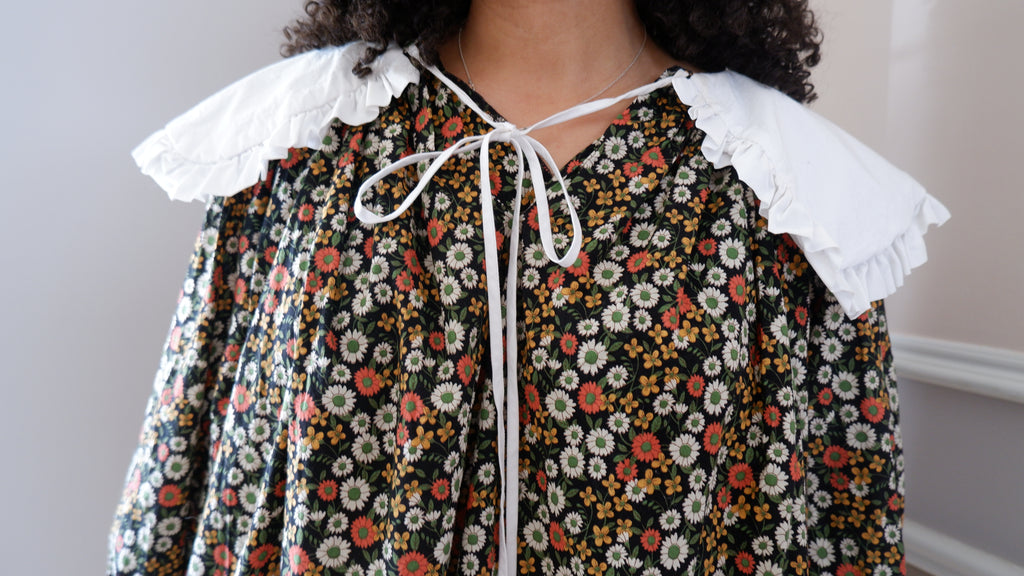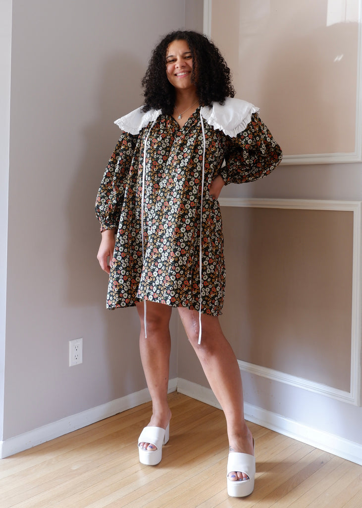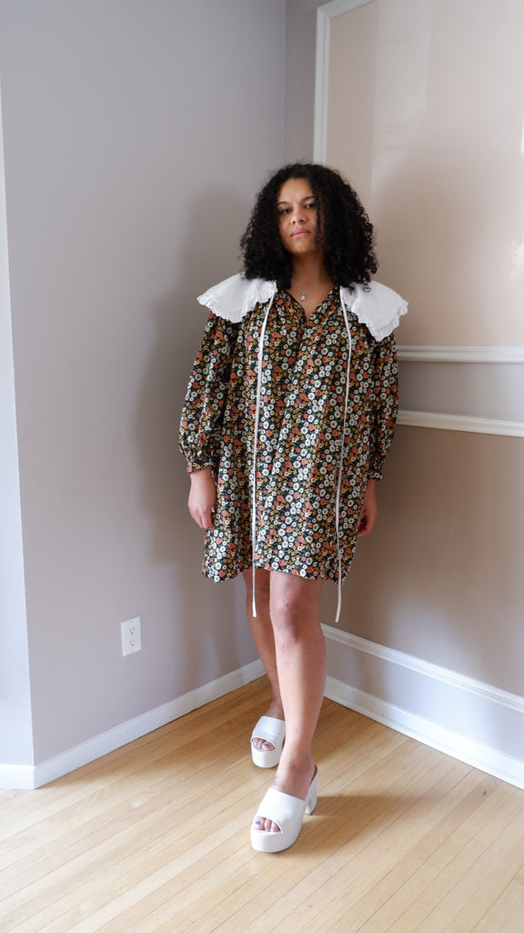 Modelled after our popular Sawyer top, the Mandy dress is just as versatile and fun to wear. The Mandy dress falls just above the knee, has an exaggerated white cotton collar that ties in a bow at the front and super roomy raglan sleeves.