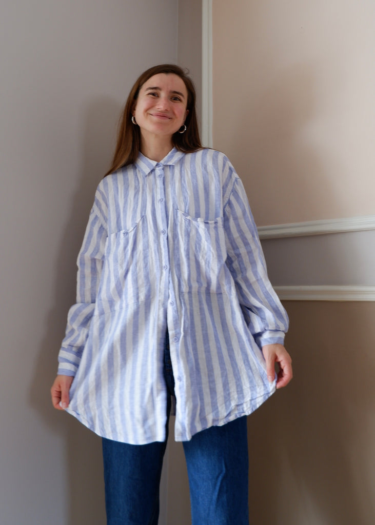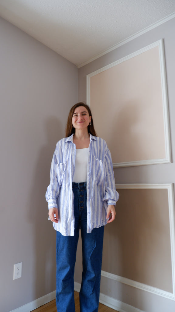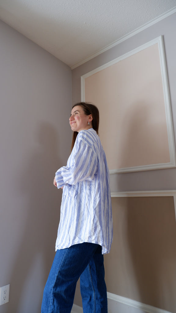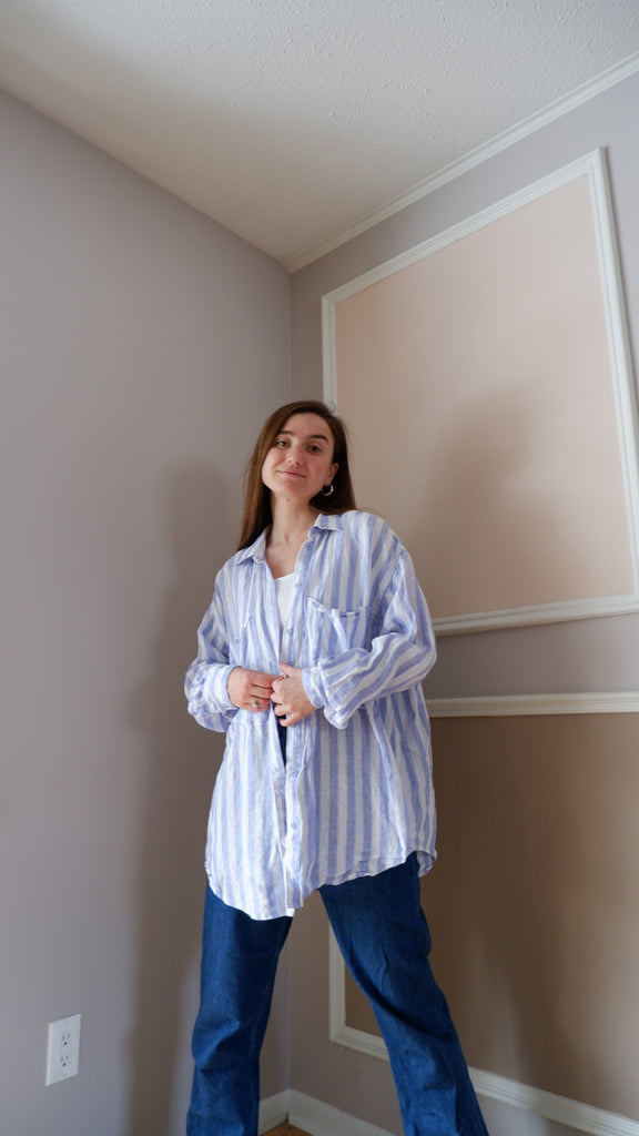 Left on Friday Blue Stripe 100% Linen Button Up - L/XL