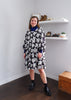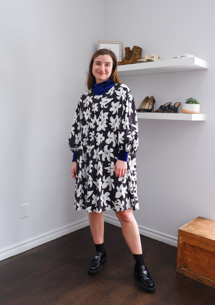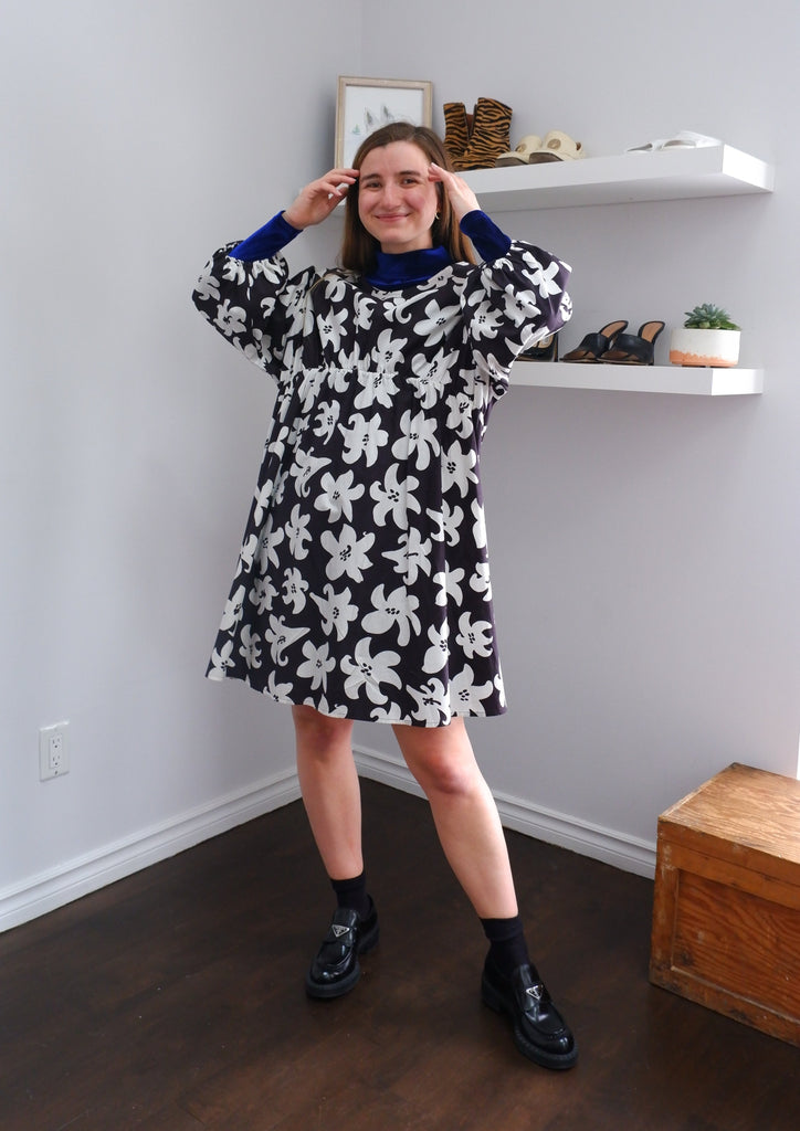 Designer Maija Isola captures the wild narcissus in bold black-and-white contrast on this flouncy cotton dress with elbow-length puff sleeves.