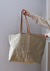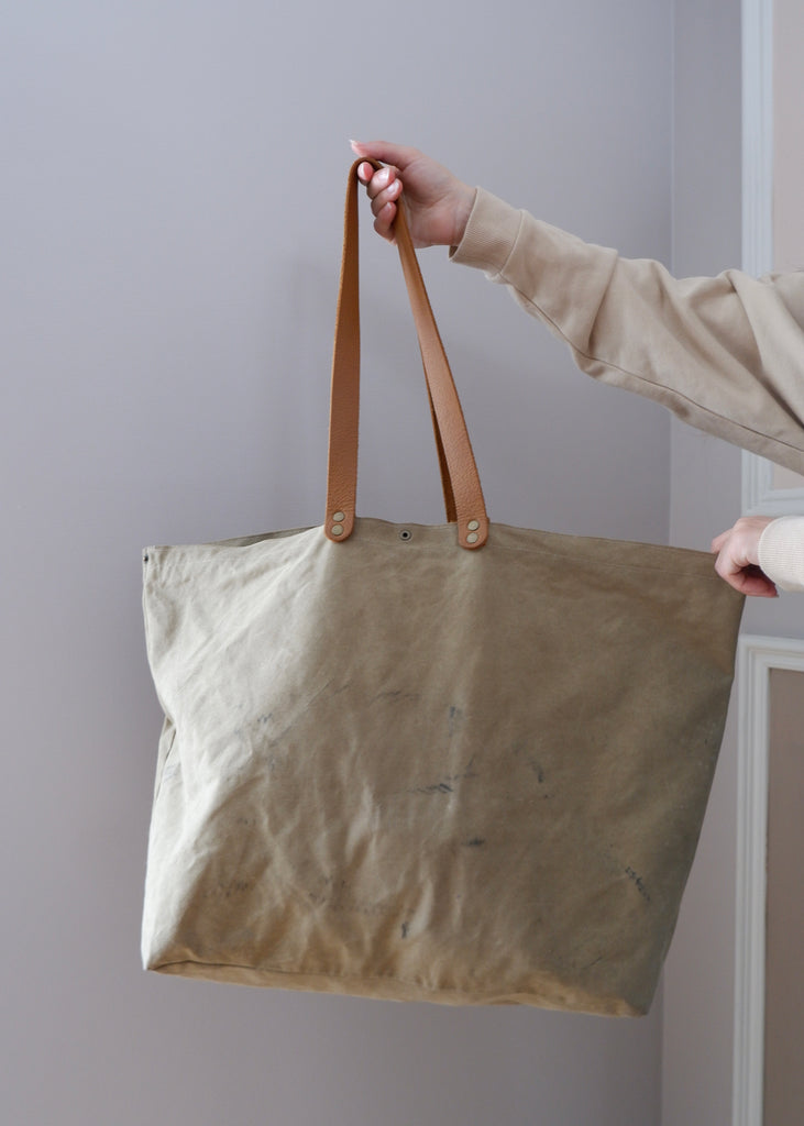Handles are full-grain leather, and are attached with antique brass rivets.